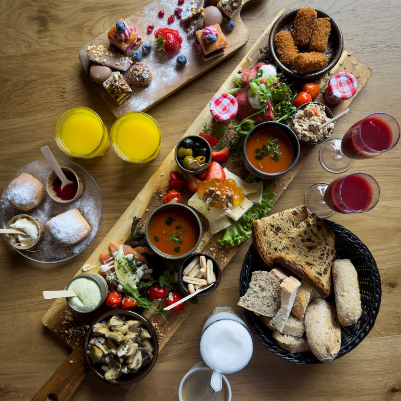 We serveren een uitgebreide luxe brunchplank met o.a. heerlijke soep, landbrood, krentenwegge, Bawykov zalm, carpaccio, tonijnsalade, gebakken champignons, mini kroketjes, dippers, knoflooksaus, gemarineerde olijven. Daarbij een glas verse jus en een smoothie van rood fruit.