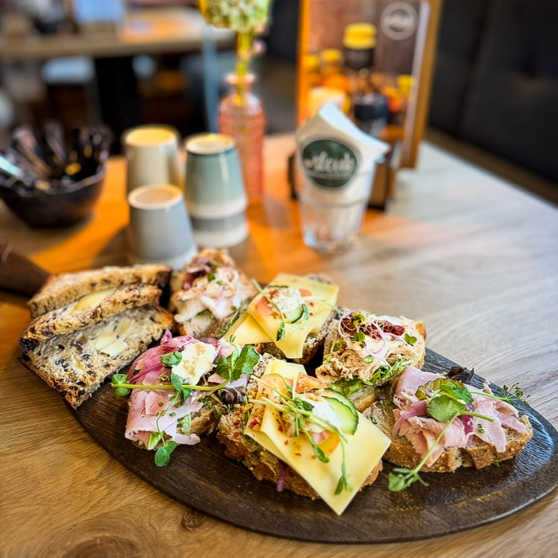 Uitgebreide brunch met soep, landbrood, krentenwegge, Bawykov zalm, carpaccio, tonijnsalade, gebakken champignons, mini kroketjes, dippers, knoflooksaus, gemarineerde olijven, scones met clotted cream en bosvruchtenjam, lekkernijen, smoothie, verse jus en onbeperkt koffie/thee.